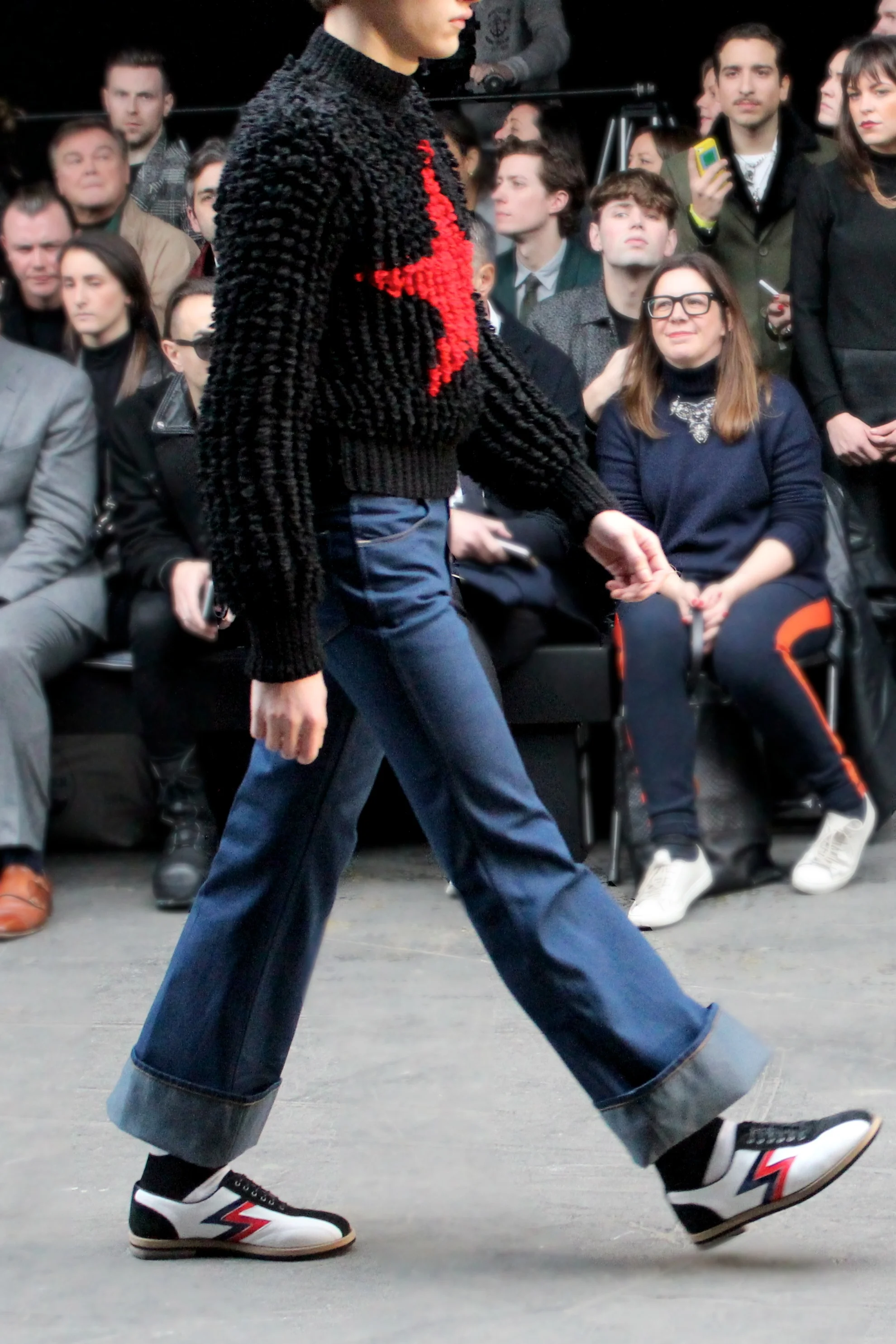 The TOPMAN design man is quite different from the TOPMAN man. As a premium line of TOPMAN that is designed biannually for LC:M, there's no time to be shy of bold themes and unique styles. Rather than just rock, TOPMAN wanted glam rock. The yellow tartan invitation came with a wristband similar to those in festivals. It would seem likely that TOPMAN has decided to show a festival-themed catwalk. But I, and I'm sure many, was so wrong. It was full-on cowboy star-studded jackets, jeans that had oversized turn ups above the ankle, and classic, retro white sneakers; cropped bomber jackets that, unlike the plain ones found in TOPMAN, had loud graphic prints on the back. Maintaing the 'Far Eastern Psychedelia' theme, ombre mohair floor-length 'carpet' coats, tartan patchwork and bowling shoes with lightning bolts were all inspirations from the 70s, following the SS15 collection last season. Topman Design Creative Director, Gordon Richardson altered several fittings of chalk striped suits; incorporating peak lapels and changing the amount of buttons. He stated his disapproval for normcore, renewed 70s fittings to suit the modern crowd and believed flare jeans, even though it would take a long period of time, has the potential of a comeback.