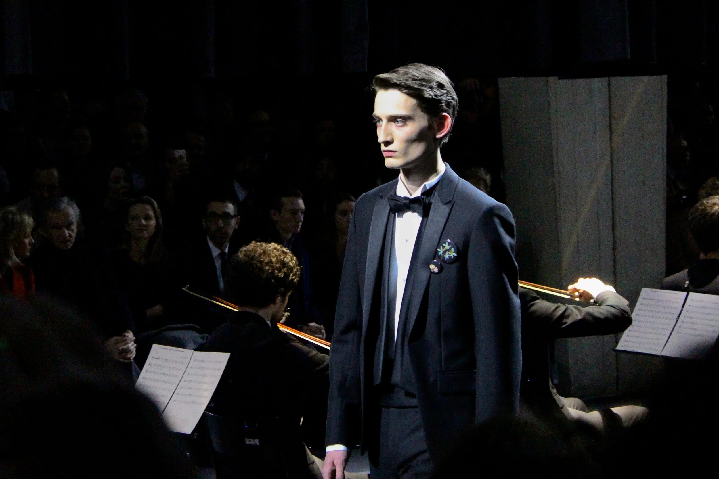 Van Assche opened the collection with his original inspiration of 'sartorial with hyper formality. Evening tail suits and dinner suits were adorned with badges where traditional buttonhole flowers are pressed and encased in these plastic badges; being yet another example of Van Asshe modernizing for the 21st century man. As the collection progressed, the original track fused with the live orchestra, where hints of neon return to the catwalk in the form of prints on coats and trousers. Although the colorful sticker invitation suggested more colour than was seen, this hiver collection has proven itself to be much more wearable (should you dare to accessorize with the badges).