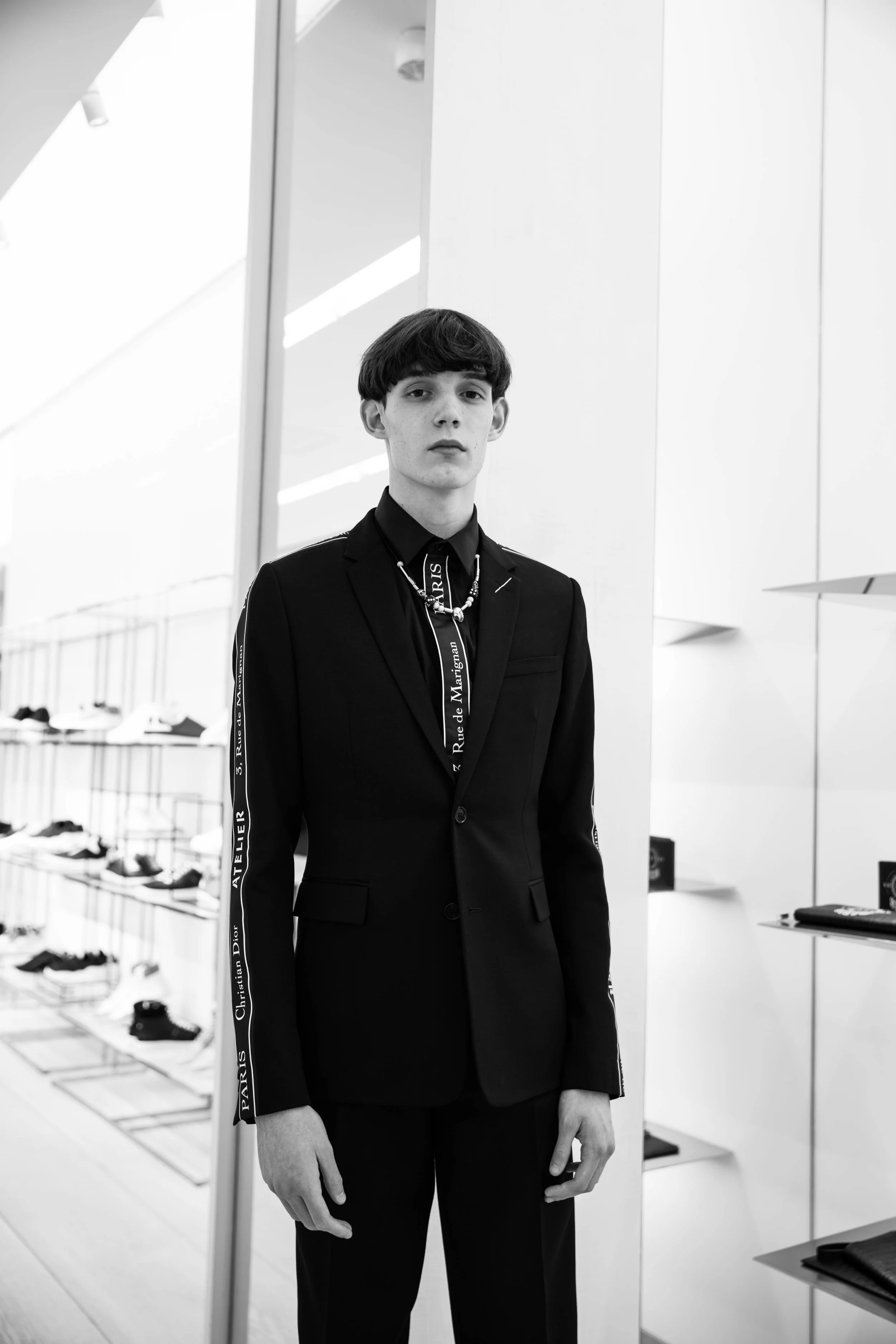 Since Van Assche took on his creative reign in 2007 at Dior Homme, the first question that came to mind was, ‘what was the DNA?’ To which, the question had no definitive answer to. Dior Homme was not found during the lifetime of Mr. Christian Dior and so references to the archive were limited. However, Van Assche’s interpretation of l’ADN of Dior Homme (French method of saying DNA) is the stark contrast between tradition and creativity. The graphic ‘university’ logo that reads ‘Late Night Paris’ in this collection resonates the coming-of-age and sense of freedom in the process. The looks here are often combined with short shorts, formalised by the fusion of traditional tailoring. Van Assche recognised the significance of the Dior bar jacket by opening the show with looks, the primary three of which were presented solely with black garments and decorated with silk ribbons that spelt the Dior Homme atelier at 3 Rue de Marignan. Considering that Van Assche has not made references to the bar jacket, even in the hyper formal Hiver 2016 collection, silhouette 8 of this collection pays particular tribute to Mr. Christian Dior's first collection, 'La Ligne Corolle', presented on 12th of February 1947.