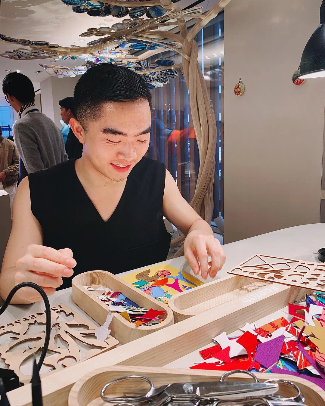 In today’s workshop session, we designed notebooks with scrap raw materials which were then cut into the iconic shapes and items, like the Samarcande horse and the Losange scarves. Eager fans will also recognise that I cornered off the edges in my notebook design with raw materials, like leather and silk, similar to the pattern in the Quatre Coins Scarf.