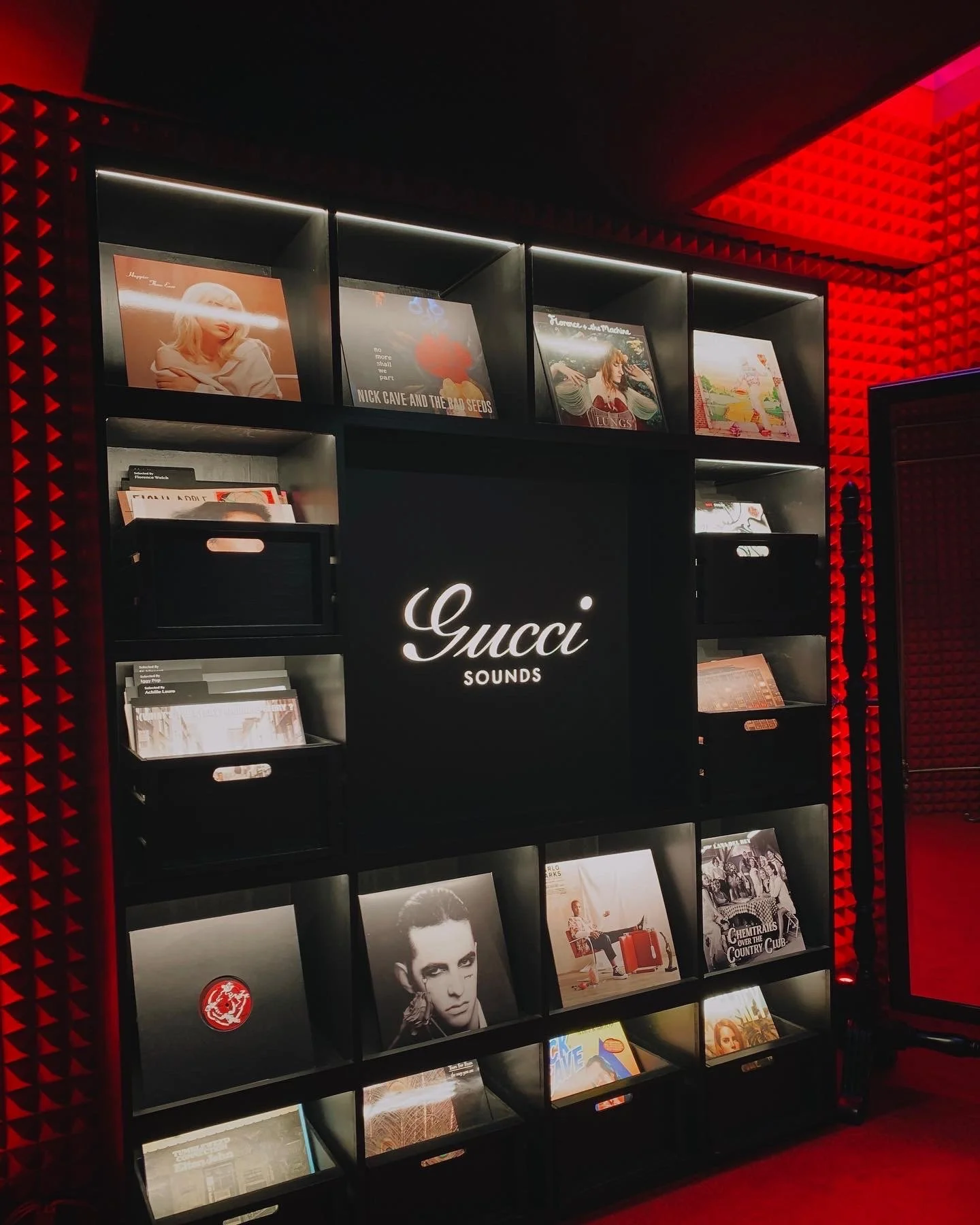 The experience continues in an adjacent room, complete with the exact cameras and flashbulbs used in the collection release. Opposite, a wall of flora and fauna that shows the Aria runway. With a pre-booking, guests can also visit the (free) Gucci cafe and the plush red listening lounge, with a Gucci sounds played on a black Gucci record player.
